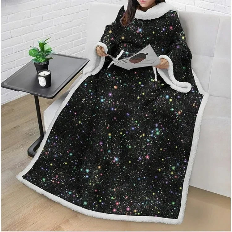 Oubliez la couverture encombrante ! Voici le plaid-vêtement indispensable, un véritable sweat molletonné avec des manches intégrées.